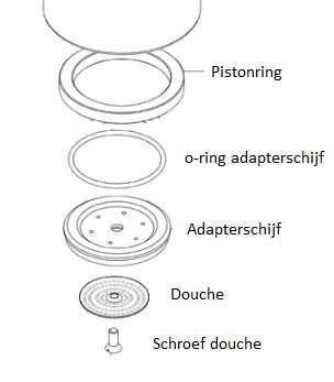 De douche en adapterplaat van de machine adviseren we minimaal 1x per half jaar los te halen en even te laten weken in een oplossing van warm water met een scheutje groepenreiniger.